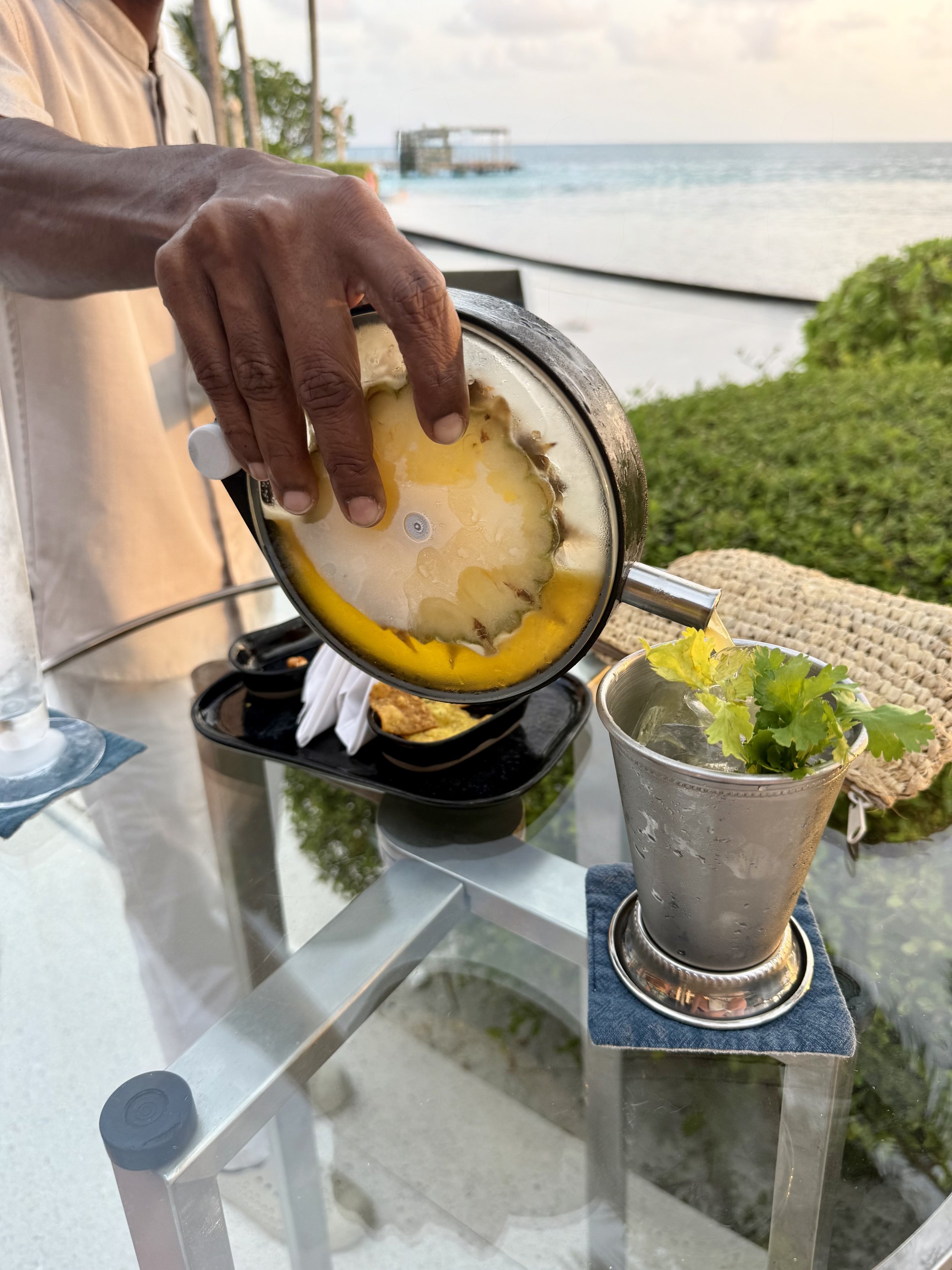 As the day winds down, the resort has one more surprise up its sleeve: the sunset ritual. Lagoon-side, as the sky drips from gold to coral to violet, Maldivian drums begin to play—a soft heartbeat against the water. Torches flicker, the air is warm and salty, and you’re swept into a ceremony that beautifully blends Maldivian island tradition with Ritz Carlton elegance. It’s soulful, moving, and one of those pinch-me moments you’ll want to pocket forever.
